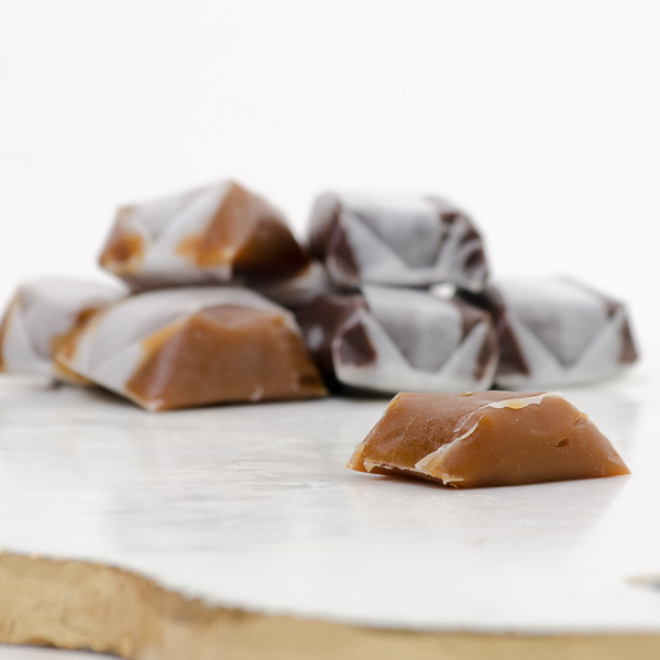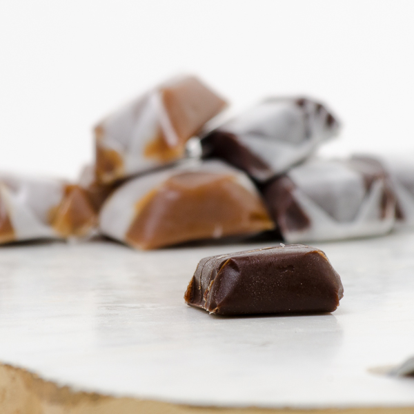Our own hand wrapped caramels are an old fashioned classic made with farm fresh butter and premium vanilla extract. To make the chocolate variety, we blend pure chocolate into the caramel as it is cooking, resulting in a rich chocolate caramel. Both varieties are wrapped in wax paper and gift boxed.