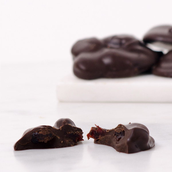 Our fruit clusters are handmade with dark chocolate. One box of Wertz Candies Chocolate Fruit Clusters includes 48 pieces.