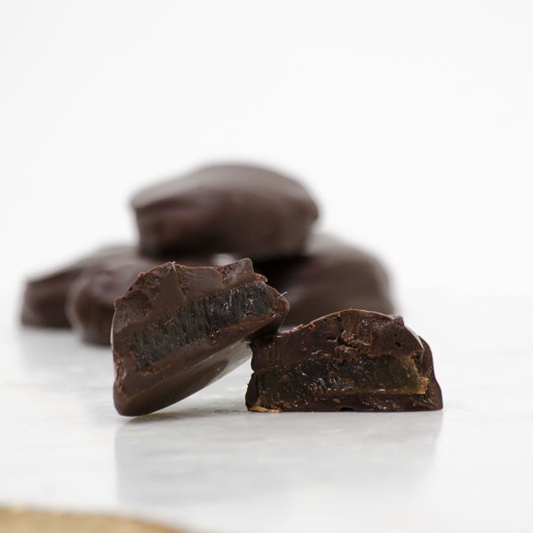We take real slices of sweet and spicy glazed ginger root and hand dip it in dark chocolate. One box of Wertz Candies Dark Chocolate Glazed Ginger includes 24 pieces.