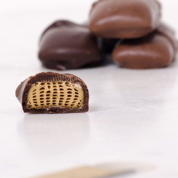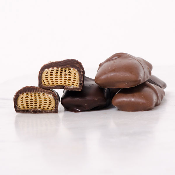 Our molasses honeycomb is available in milk or dark chocolate. One box of Wertz Candies Molasses Honeycomb includes 60 pieces.