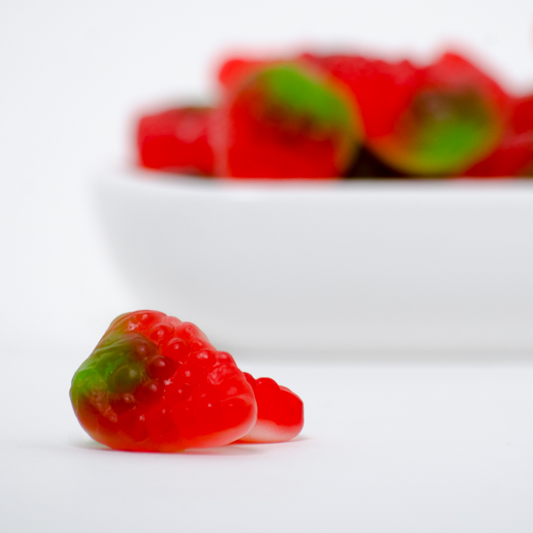 Approximately 1lb of Strawberry Cream Gummies in a variety of fruit flavors carefully gift boxed by Wertz Candies.